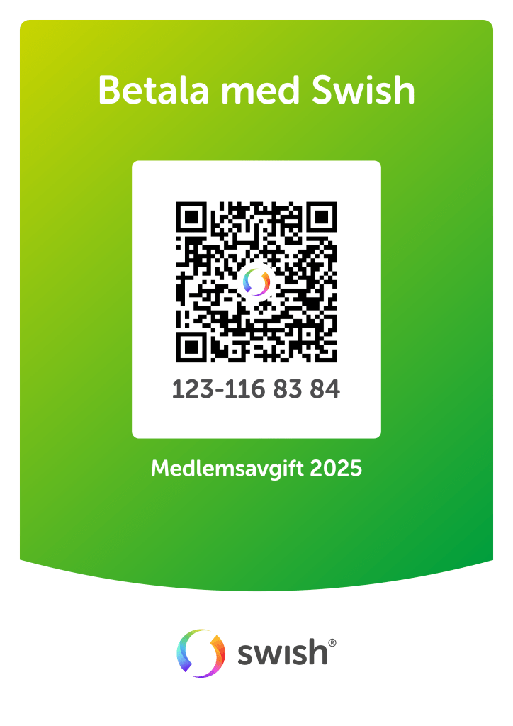 Medlemsavgiften för 2025 ligger som tidigare på 300 kronor. Du kan betala via Swish (använd QR-koden ovan) eller din internetbank (bankgiro).